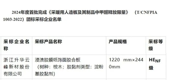2025年初,中国林产工业协会标准化技术委员会公布了2024年度首批完成《采暖用人造板及其制品中甲醛释放限量》(T/CNFPIA 1003-2022)团标采标企业名单,莫干山荣登榜单,成为行业内少数能够满足HENF级环保标准的企业之一。