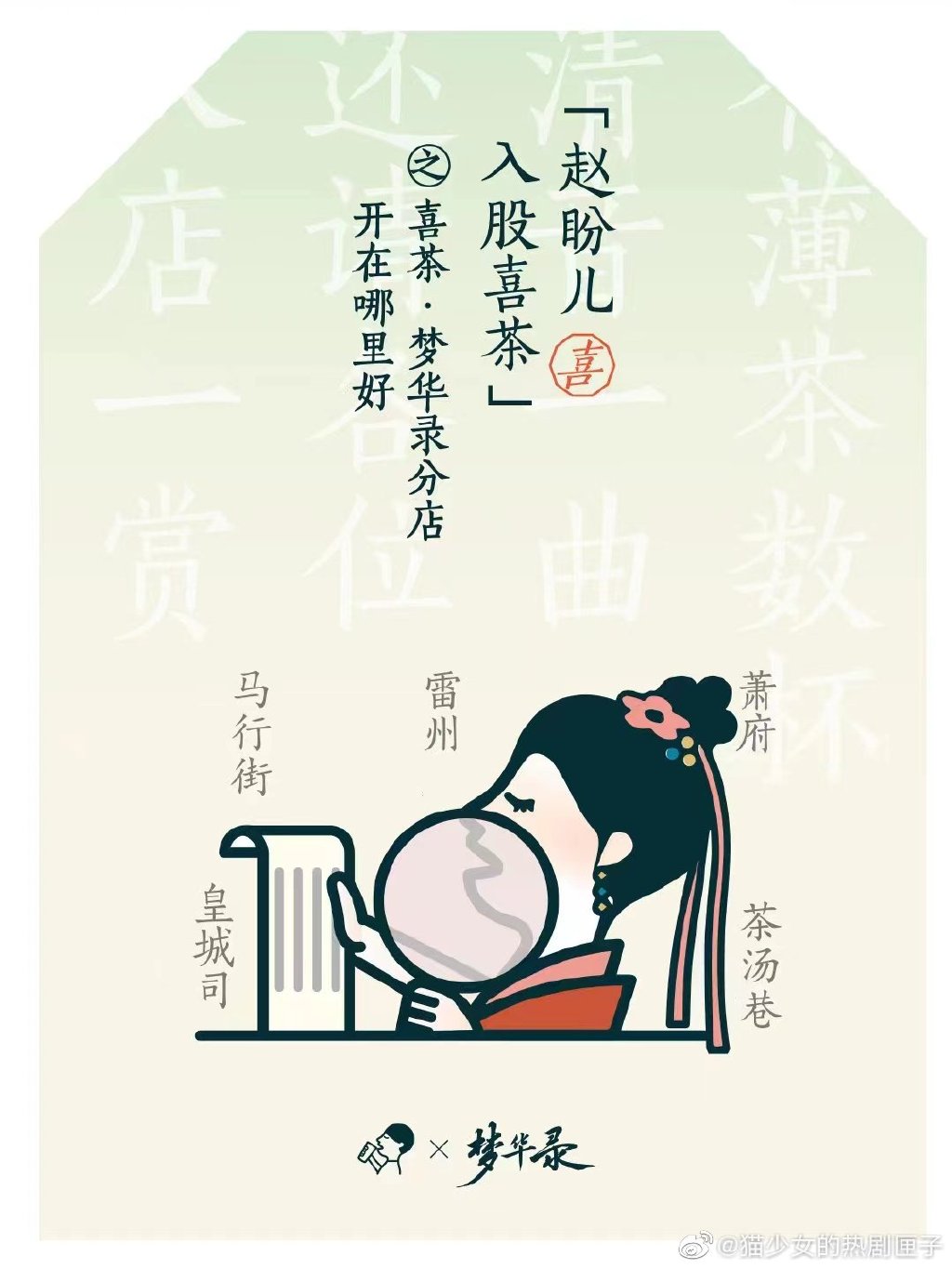 今年6月,喜茶首次与古风影视剧联名。在《梦华录》大结局前夕,喜茶在官方公众号、微博、小红书的社交平台官方账号发布了联名推文,通过阿喜(喜茶的自称)与赵盼儿的「斗茶」进行茶文化与品牌价值的升华,从而引出以「喜·半遮面」为主题的茶饮新品。
