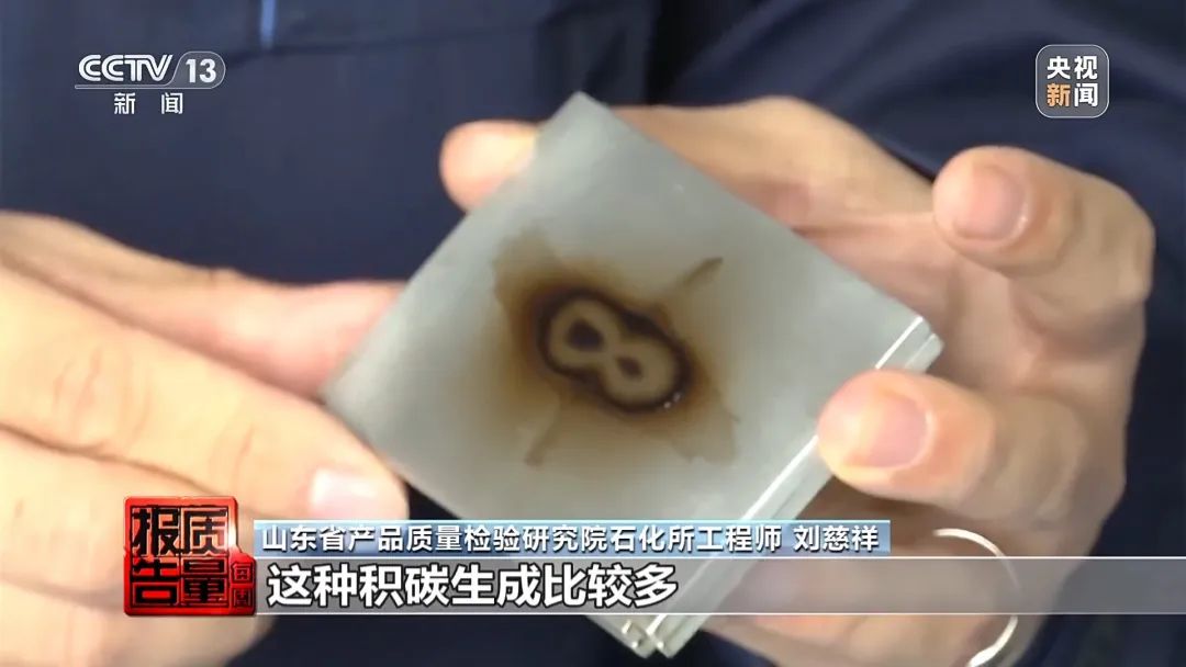 山东省产品质量检验研究院石化所工程师 刘慈祥:像这种沉积物基本上没有,就表明清净剂清除积碳的效果比较好,这种积碳生成比较多,就说明这个产品根本就没有清除积碳的效果。