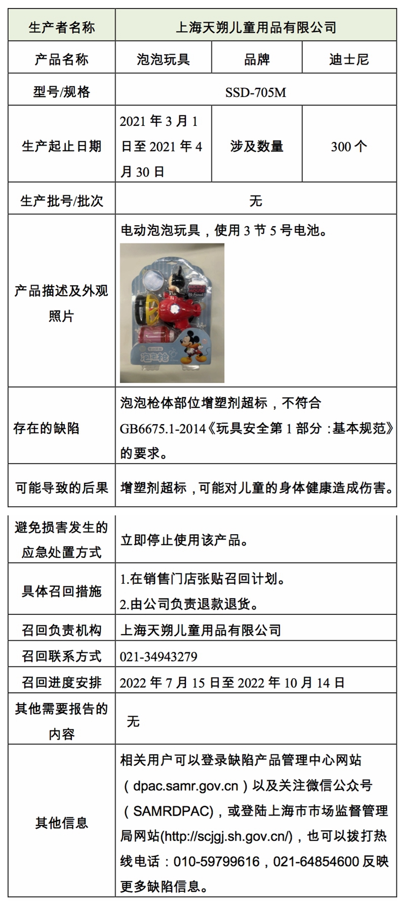中国经济网7月14日讯(记者 刘芃)据微信公众号“上海市场监管”消息,上海天朔儿童用品有限公司自2022年7月15日至2022年10月14日召回于2021年3月1日至2021年4月30日期间生产的型号为SSD-705M的“迪士尼”泡泡玩具,共涉及产品300个。
