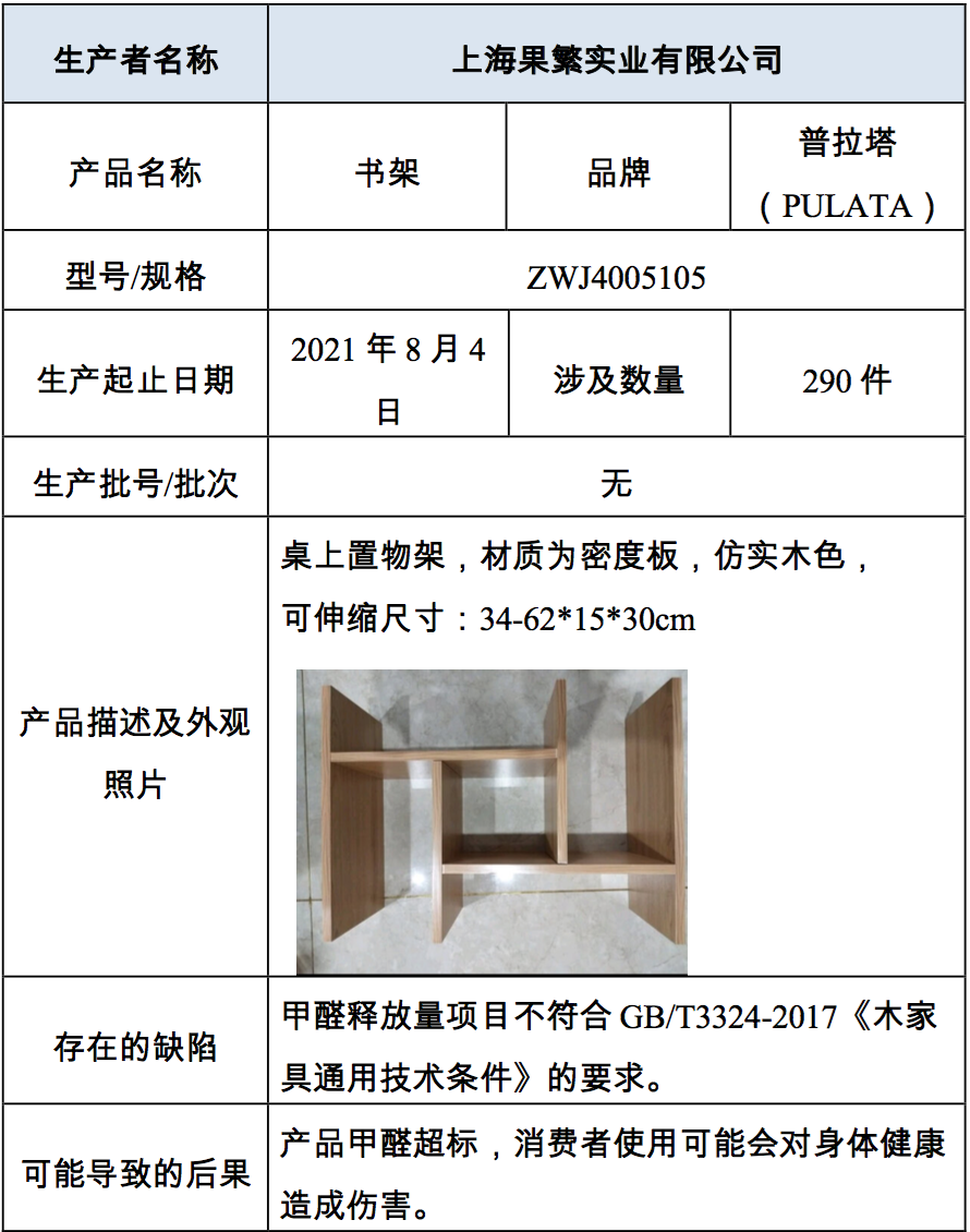 上海果繁实业有限公司召回2021年8月4日期间生产的型号为ZWJ4005105的“普拉塔(PULATA)”书架,涉及290件。