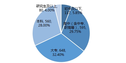 从教育程度看,初中及以下有117人,占比8.85%;高中(含中专、职高等)有595人,占比29.75%;大专有648人,占比32.40%;本科有560人,占比28.00%;研究生及以上有80人,占比4.00%。