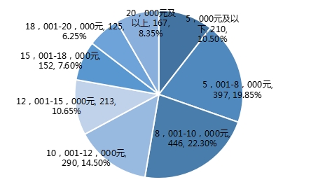 5001-8000元397人,占比19.85%;8001-10000元446人,占比22.30%;10001-12000元290人,占比14.50%;12001-15000元213人,占比10.65%;15001-18000元152人,占比7.60%;18001-20000元125人,占比6.25%;20000元及以上167人,占比8.35%。