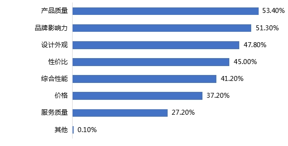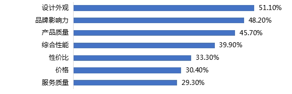 51.10%的调查对象最看重的因素是设计外观;其次是品牌影响力,占比48.20%;看重服务质量的人数最少,占比为29.30%。