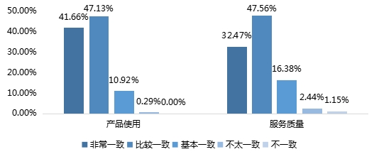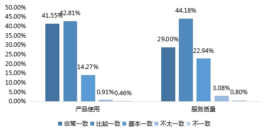 在品牌产品使用的期望一致性调查中,47.13%的调查对象表示比较一致,0.29%表示不太一致;在品牌整体服务质量的期望一致性调查中,47.56%的调查对象表示比较一致,认为不太一致和不一致的人数较少,占比分别为2.44%和1.15%。