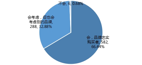 调查结果显示,超过六成的调查对象仍会考虑购买当前使用的品牌,是品牌的忠实购买者;有32.88%的调查对象表示在兼顾当前品牌的同时,也会考虑其他的品牌;还有0.68%的人选择不会再考虑购买当前使用的品牌,理由包括想换新款、对产品质量不太满意等。
