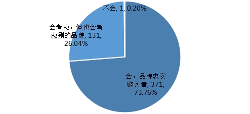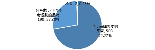 调查结果显示,七成的调查对象仍会考虑购买当前使用的品牌,是品牌的忠实购买者;有28.57%的调查对象表示在兼顾当前品牌的同时,也会考虑其他的品牌;还有0.74%的人选择不会再考虑购买当前使用的品牌,理由包括自身条件原因、体验其他品牌等。