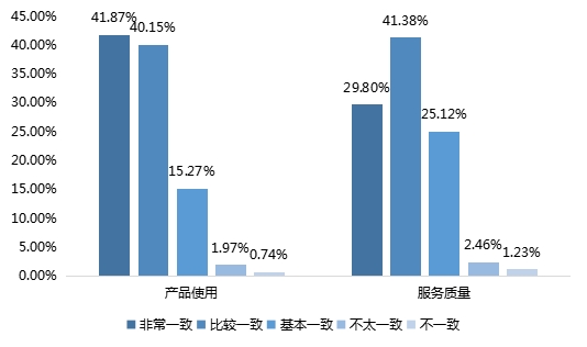 在品牌产品使用的期望一致性调查中,41.87%的调查对象表示非常一致,认为不太一致和不一致的人数较少,占比分别为1.97%和0.74%;在品牌整体服务质量的期望一致性调查中,41.38%的调查对象表示比较一致,认为不太一致和不一致的人数较少,占比分别为2.46%和1.23%。