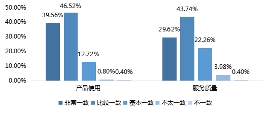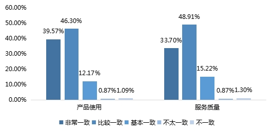 在品牌产品使用的期望一致性调查中,43.20%的调查对象表示比较一致,2.41%认为不太一致;在品牌整体服务质量的期望一致性调查中,45.39%的调查对象表示比较一致,认为不太一致和不一致的人数较少,占比分别为2.63%和1.54%。