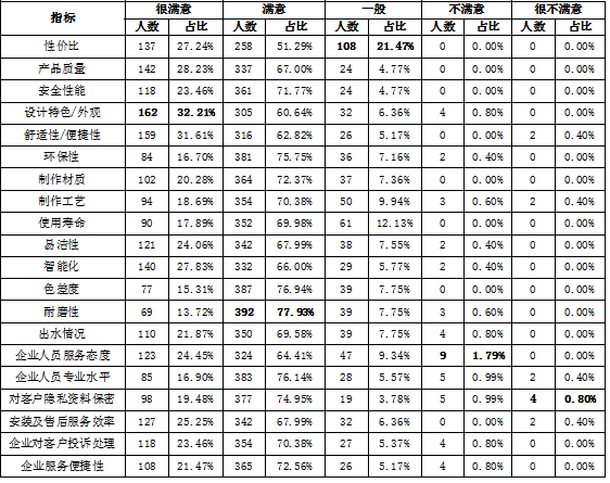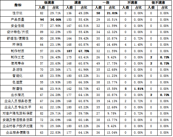 选择很满意人数最多的是“产品质量”,占比为36.87%;选择满意人数最多的是“对客户隐私资料保密”,占比为64.27%;选择一般人数最多的是“性价比”,占比为15.87%;选择不满意人数最多的是“出水情况”,占比为1.26%;选择很不满意人数最多的是“舒适性/便捷性”和“耐磨性”,占比均为0.57%。