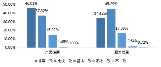 在品牌产品使用的期望一致性调查中,46.01%的调查对象表示非常一致,1.45%认为不太一致;在品牌整体服务质量的期望一致性调查中,45.29%的调查对象表示比较一致,认为不太一致和不一致的人数较少,占比分别为2.54%和0.72%。