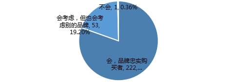 调查结果显示,超过六成的调查对象仍会考虑购买当前使用的品牌,是品牌的忠实购买者;有34.06%的调查对象表示在兼顾当前品牌的同时,也会考虑其他的品牌;还有0.13%的人选择不会再考虑购买当前使用的品牌,理由质量太差。