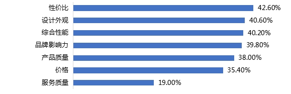 42.60%的调查对象最看重的因素是性价比;其次是设计外观,占比40.60%;看重服务质量的人数最少,占比为19.00%。