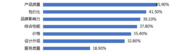 45.90%的调查对象最看重的因素是产品质量;其次是性价比,占比41.50%;看重服务质量的人数最少,占比为18.90%。