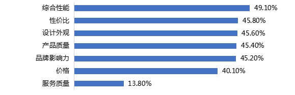 49.10%的调查对象最看重的因素是综合性能;其次是性价比,占比45.80%;看重服务质量的人数最少,占比为13.80%。