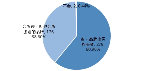 调查结果显示,六成的调查对象仍会考虑购买当前使用的品牌,是品牌的忠实购买者;有38.60%的调查对象表示在兼顾当前品牌的同时,也会考虑其他的品牌;还有0.44%的人选择不会再考虑购买当前使用的品牌,理由为当前产品性能较差等。