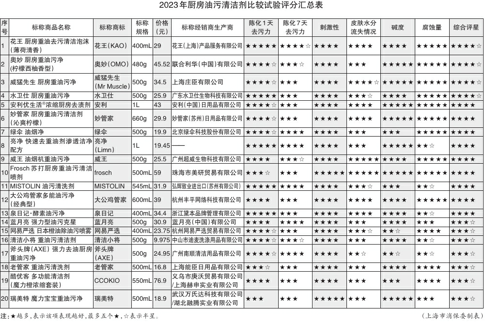 如标称由花王(上海)产品服务有限公司生产经销的花王厨房重油去污清洁泡沫(薄荷清香),标称商标为花王(KAO),标称规格为400mL,陈化1天去污力达5星,陈化7天去污力为4星半;标称由安利(中国)日用品有限公司生产经销的安利优生活?浓缩厨房去渍剂,标称商标为安利,标称规格为1L,陈化1天去污力为4星半,陈化7天去污力为3星。