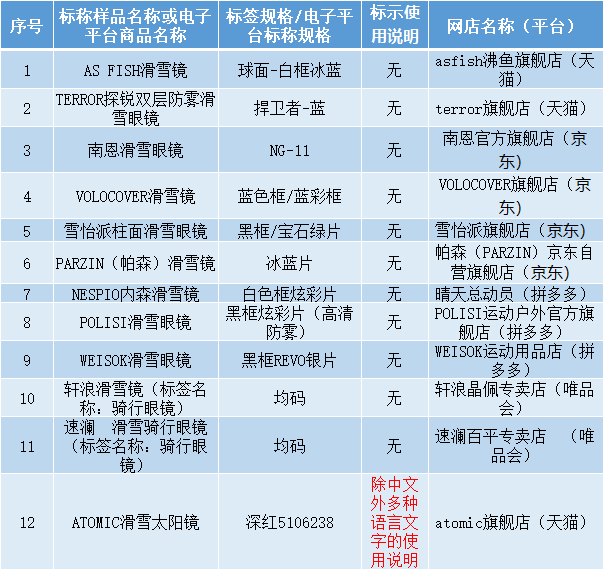仅7批次滑雪镜标注了新国标,1批次进口产品标注EN(欧洲标准)。