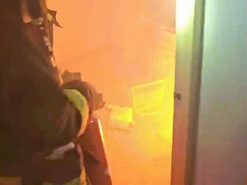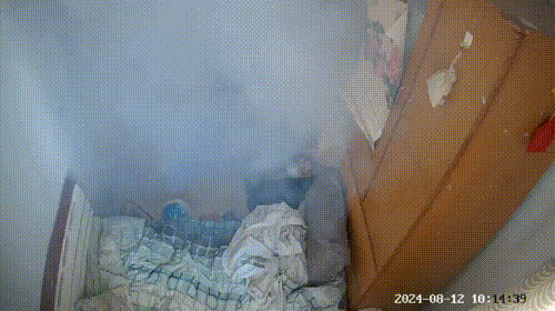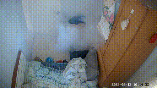 实验选择在一个六平方左右的房间内进行,室内摆放床、衣柜等家具,消防救援人员将电动车锂电池放在房间内,并用动物身体组织代替人体皮肤贴近电池。