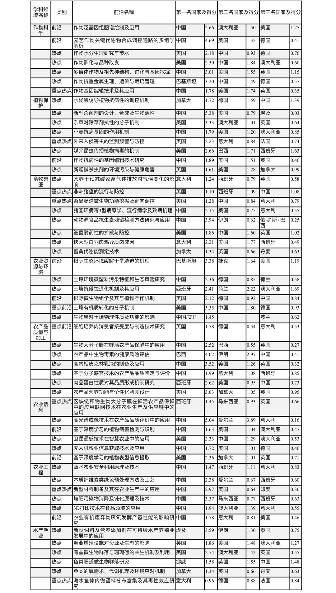 附表 2021农业8大学科领域研究热点前沿、各热点前沿TOP3国家及其表现力指数得分