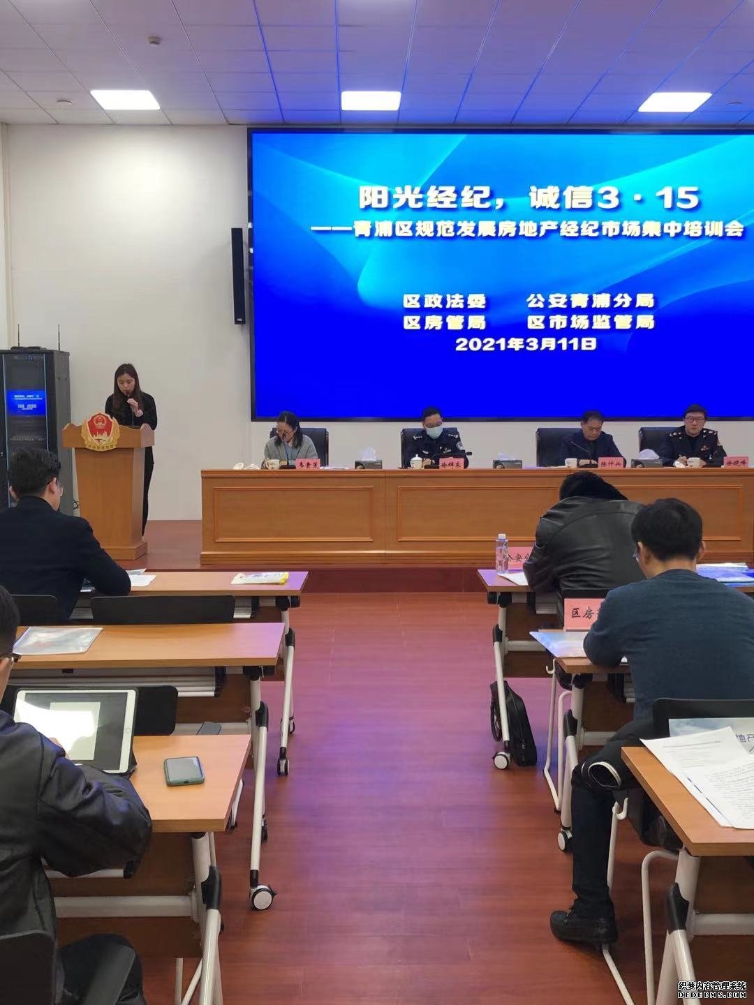 在3•15国际消费者权益保护日即将来临之际,为加强房地产经纪市场监管,促进整个房地产市场平稳健康规范发展,让老百姓买得放心,卖得顺心,住得安心,2021年3月11日下午,由上海市青浦区市场监管局牵头,区政法委、公安青浦分局、区房管局、区市场监管局共同组织召开了以“阳光经纪,诚信3•15”为主题的规范发展房地产经济市场集中培训会,区内33家房地产经纪企业代表参加会议。