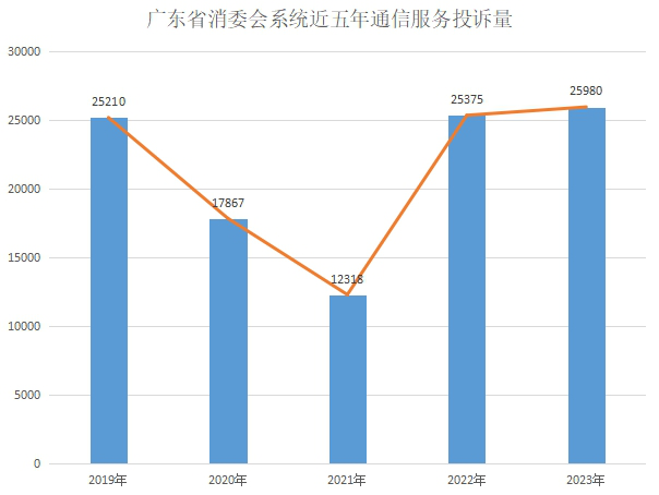 《报告》显示,2019年至2023年,广东省消委会系统共收到通信服务投诉106750件,占投诉总量的5.12%,呈现出先降后升的“V”字走势。其中,前3年(2019年至2021年)相关投诉持续下降,从25210件降至12318件,平均降幅近三成。但随着通信服务市场竞争日趋激烈、业务更加多元,2022年起通信投诉再度飙升,投诉量达25375件,同比上升106.00%,而2023年维持高位(25980件)。