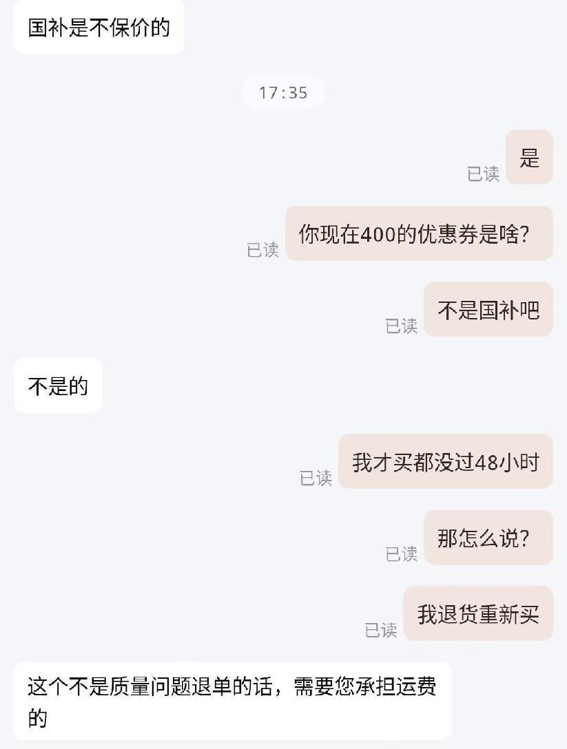 面对这突如其来的降价,李先生深感愤怒与无奈。他尝试通过平台客服协调退还差价,但得到的答复却是:由于产品享受了政府补贴,差价不予退还。李先生气愤地表示:“有种被当傻子耍的感觉。”经过多次沟通,李先生最终与客服协商达成了无条件退货的协议,退货运费由平台承担。随后,李先生又用家人的账号领取政府补贴后,加上新的活动优惠,以低于原购买价500元的价格于同一网购平台再次购买了同一款空气净化器。