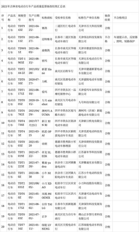 2021年4季度,吉林省市场监督管理厅组织开展了全省电动自行车产品质量监督抽查,共抽查19家销售者销售的20批次产品。经检测,1家销售者销售的1批次产品不合格,不合格产品发现率为5%。对不合格产品的生产者、销售者由当地市场监管部门正在依法进行结果处理。