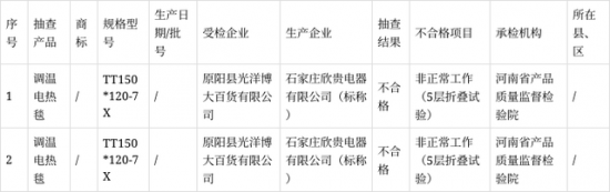 河南省新乡市市场监管局:2批次调温电热毯产品抽检不合格