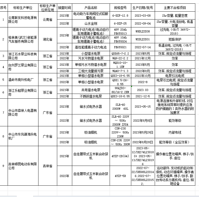 (一)抽查概况。共抽查检验1175批次产品,涉及1102家生产单位、102家销售单位,发现不合格产品127批次。其中,储水式电热水器27批次、吸油烟机24批次、快热式电热水器16批次、童车4批次、泵34批次、玉米联合收割机6批次、汽车用制动器衬片6批次、电动自行车电池10批次(详见附件1)。