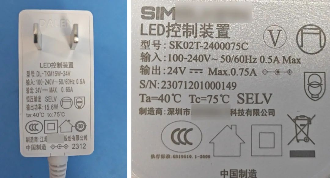 20款产品均符合GB 7000.1-2015、GB 7000.204-2008国家强制性标准。其中,有3款是电源线带插头直供电(内置整体式电源),1款是III类灯具,其余均为直插式SELV输出的灯具(使用已获证的电源)。如下图,采用直插式供电且铭牌标识中含“SELV”的产品,在安全性能上能得到较大保障。