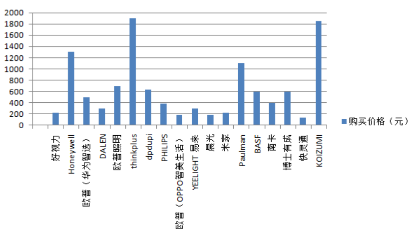 产品性价比综合分析通过对比试验结果和产品销售价格进行分析,发现在较低价格区间(不大于500元)中,好视力、欧普(华为智选)、DALEN、PHILIPS四款台灯表现较好,性价比较高;在中高价格区间(500-1000元),欧普照明表现较好;在较高价格区间(大于1000元)中,Honeywell、Thinkplus两款台灯表现较好,产品各方面评测结果均优于其他产品。